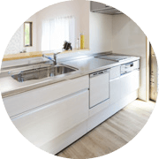 キッチンは人造大理石の天板を使用。人造大理石は汚れが付きにくく、水垢も目立ちにくいので、お掃除は比較的に楽で水まわり設備に適した素材です。