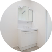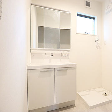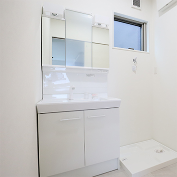 三面鏡の裏側は収納スペースとなっているため、洗面まわりの小物を収納するのにちょうど良く見た目もすっきりします。また、様々な角度からヘアスタイルの確認ができるのも三面鏡が付いている洗面台のメリットです。