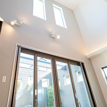 空間が広々と感じられる吹き抜け。フィックス窓から望む空の景色が毎日の生活に新鮮さや彩をプラスしてくれ、贅沢なリビングになります。夜間には壁付けスポットライトにより落ち着いた空間を演出します。