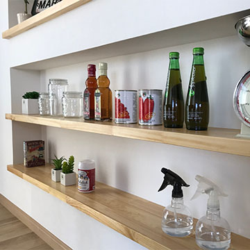 造作のキッチン収納棚。可動式になっているので収納物に応じて棚の調整が可能。また、壁に固定されているため地震などで転倒することがありません。