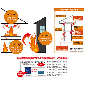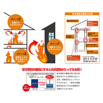建築基準法で定める準耐火構造に準ずる防火機能を持つ構造として、住宅金融支援機構が定める基準に適合する住宅をいいます。①外部からの延焼防止②各室防火③他室への延焼遅延が特徴となっております。省令準耐火仕様であれば、火災保険が通常よりお安くなる特典が付いています。