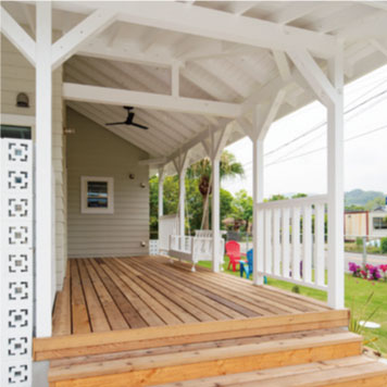 サーファーズハウスの大きな特徴の一つがこのカバードポーチ。カバードポーチでは友人を招いてバーベキューや家族団らんを楽しむことができます。リビングとカバードポーチの境目がフラットなので、リビングを広々と見せる効果もあります。