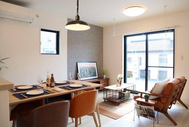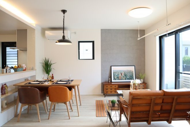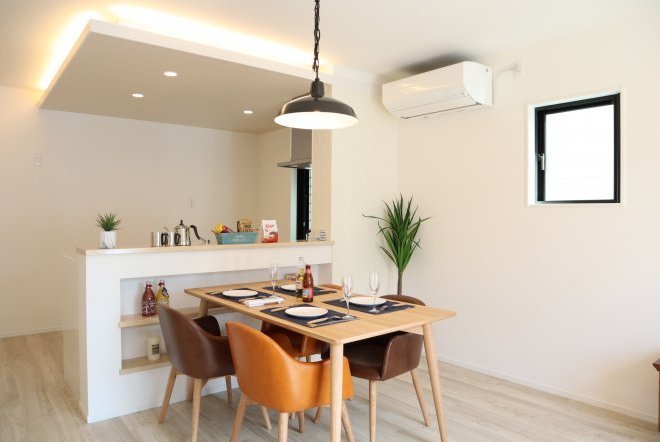 シンプルなカフェ風の内装で毎日の生活をおシャレに。集成材という人工の木材を使用しており、木材の形が変形しづらいため、隙間やひびが出にくいのが特徴です。和室スペース付きリビングでご家族団らんをお楽しみ下さい!