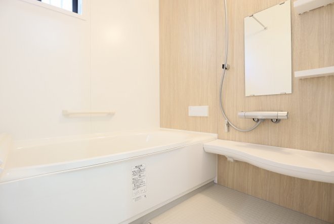 お湯に浸かった時に両腕を置けるアームレスト付き浴槽でリラックス入浴を♪ キレイサーモフロアの床は水はけが良く清潔で滑りにくくお手入れも簡単!床の冷たさを感じにくいストレスフリーな浴室!