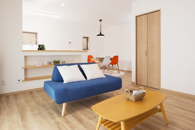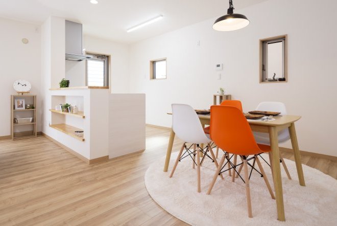 シンプルなカフェ風の内装で毎日の生活をおシャレに。集成材という人工の木材を使用しており、木材の形が変形しづらい為隙間やひびが出にくいのが特徴です。和室スペース付きリビングでご家族団欒をお楽しみ下さい!
