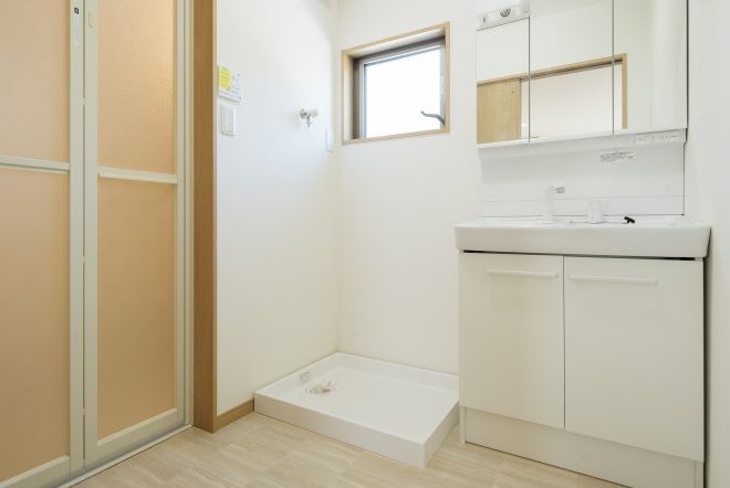 換気が可能な嬉しい小窓付き!ゆったり使える陶器製大型洗面器で水栓周りにやや傾斜があり水滴が溜まりにくい構造です!水栓は洗髪や掃除に便利なホース収納付♪鏡のくもり止めは待ち時間なしで快適