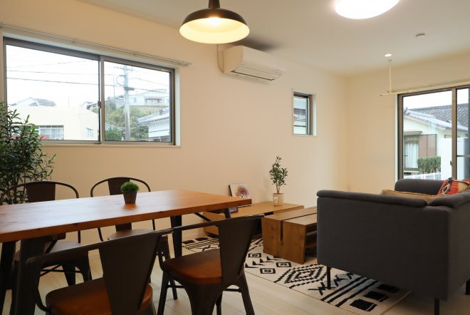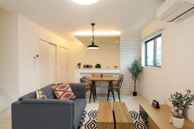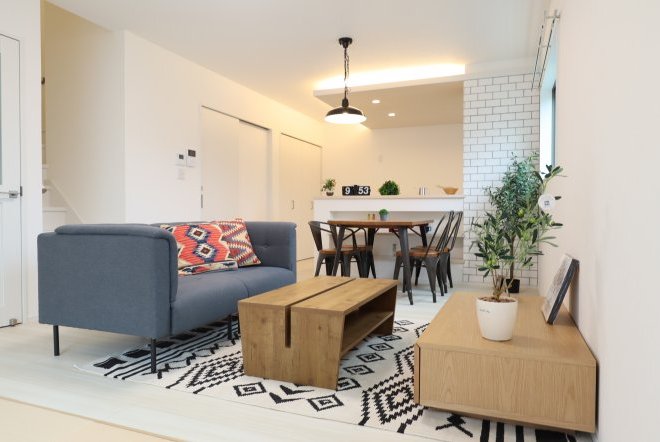 シンプルなカフェ風の内装で毎日の生活をおシャレに。集成材という人工の木材を使用しており、木材の形が変形しづらいため、隙間やひびが出にくいのが特徴です。和室スペース付きリビングでご家族団らんをお楽しみ下さい!