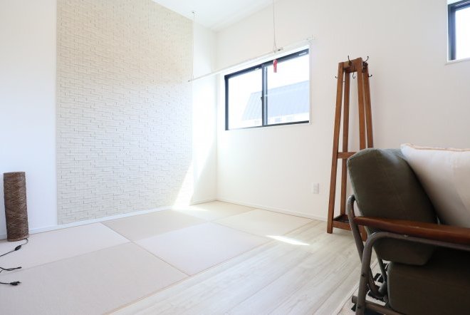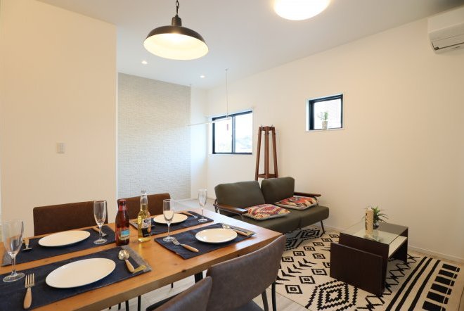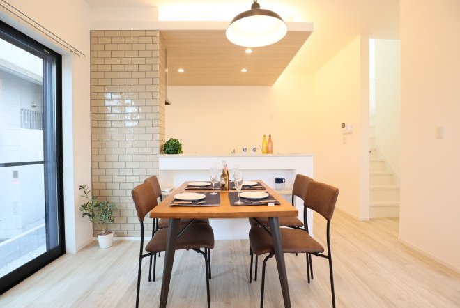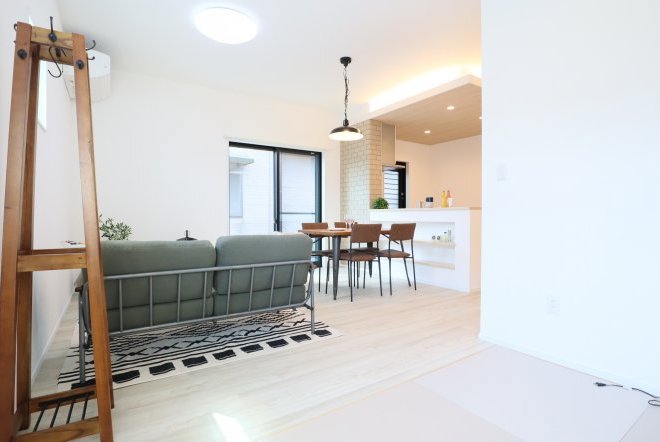 シンプルなカフェ風の内装で毎日の生活をおシャレに。集成材という人工の木材を使用しており、木材の形が変形しづらいため、隙間やひびが出にくいのが特徴です。和室スペース付きリビングでご家族団らんをお楽しみ下さい!