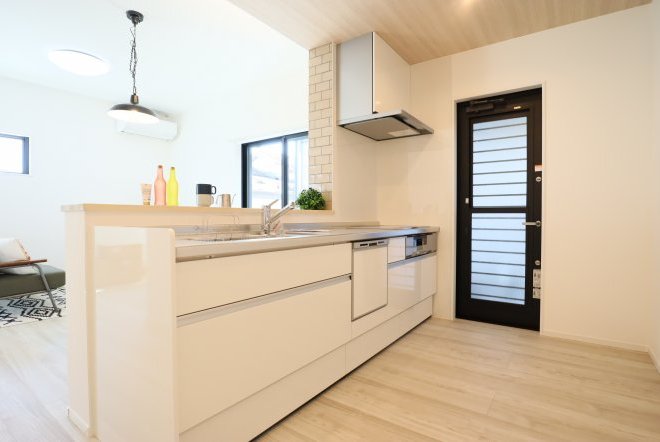 一度に5人分程の片付けが可能な食器洗い乾燥機付き!家事の時短でママのゆっくりタイムを確保♪シンクは水流の広がりをおさえて、汚れがスムーズに流れる様設計されており、後のお手入れがグッと楽になります。
