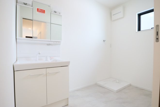 換気が可能な嬉しい小窓付き!ゆったり使える陶器製大型洗面器で水栓周りにやや傾斜があり水滴が溜まりにくい構造です!