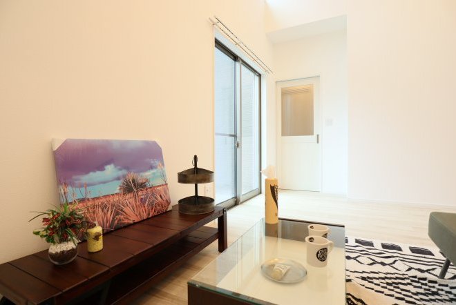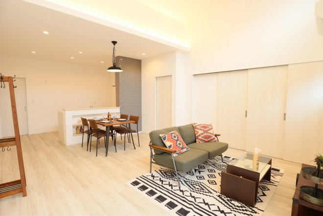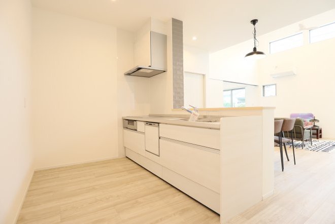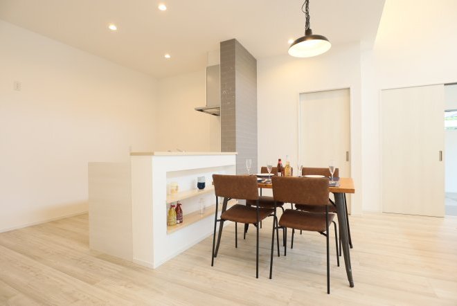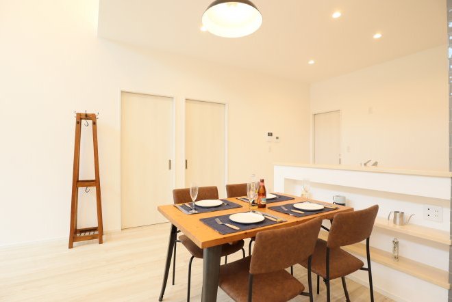 シンプルなカフェ風の内装で毎日の生活をおシャレに。集成材という人工の木材を使用しており、木材の形が変形しづらい為隙間やひびが出にくいのが特徴です。南向きリビングでご家族団欒の生活をお楽しみくださいませ。
