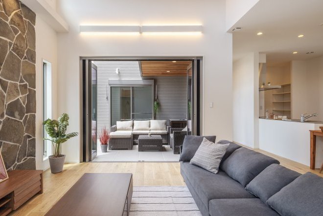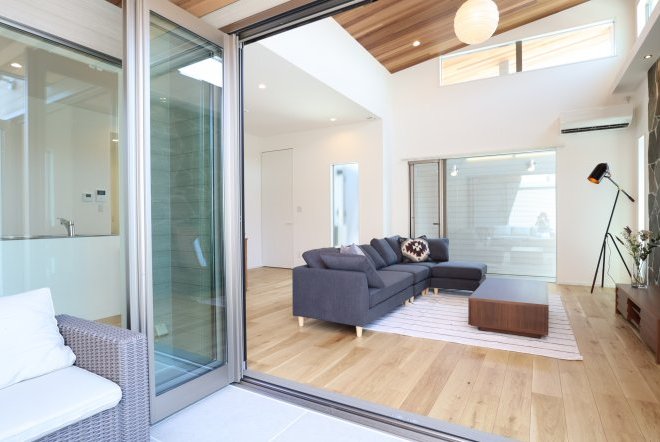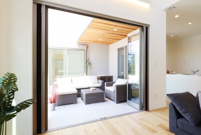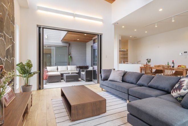 ハイグレード平家「SLH」登場。オープンテラスをリビングに配置し市街地でありながらゆったりとした生活を演出します。オール電化や収納など設備も充実しています。