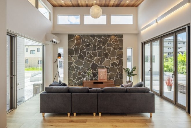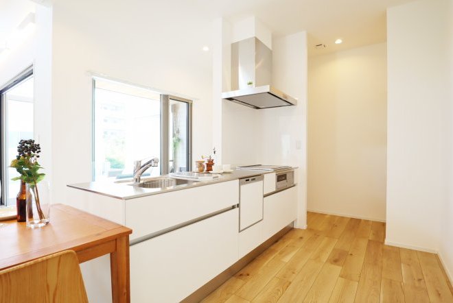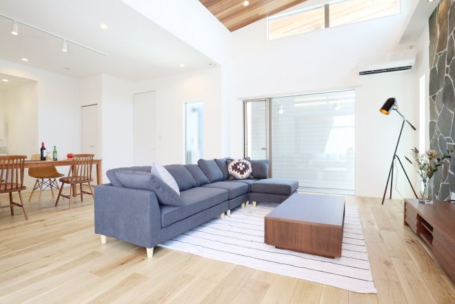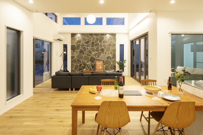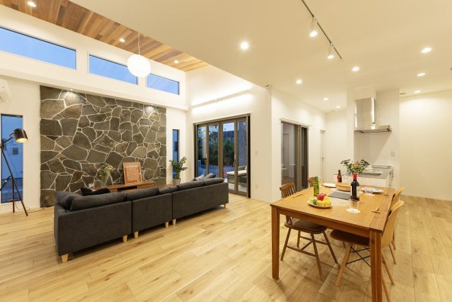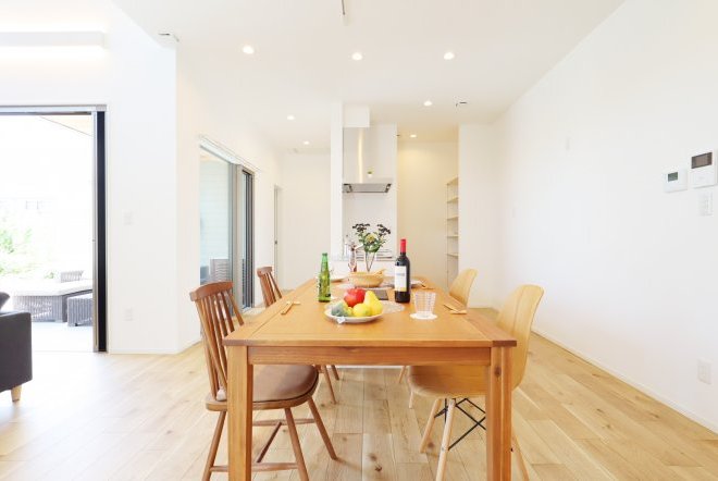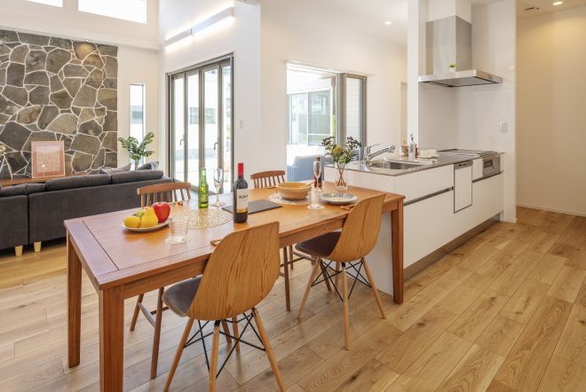 シンプルなカフェ風の内装で毎日の生活をおシャレに。集成材という人工の木材を使用しており、木材の形が変形しづらい為隙間やひびが出にくいのが特徴です。広々リビングでご家族団欒をお楽しみください!