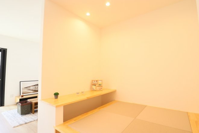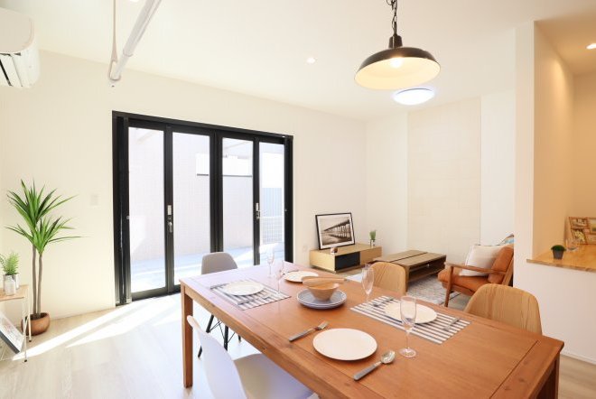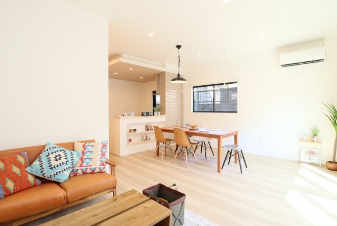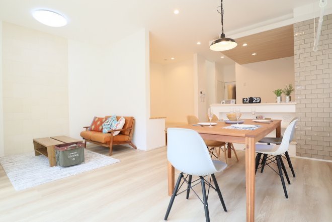 シンプルなカフェ風の内装で毎日の生活をおシャレに。集成材という人工の木材を使用しており、木材の形が変形しづらいため、隙間やひびが出にくいのが特徴です。和室スペース付きリビングでご家族団らんをお楽しみ下さい!