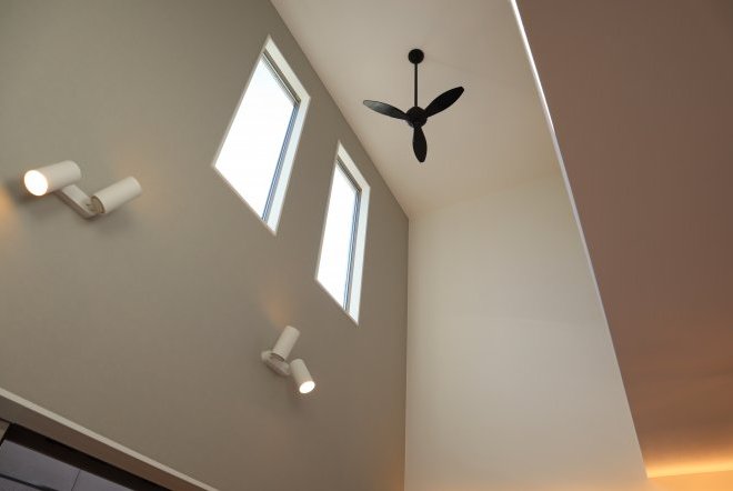 空間が広々と感じられる吹き抜け。フィックス窓から望む空の景色が毎日の生活に新鮮さや彩をプラスしてくれ、贅沢なリビングになります。夜間には壁付けスポットライトにより落ち着いた空間を演出します。