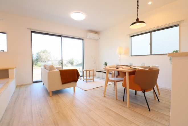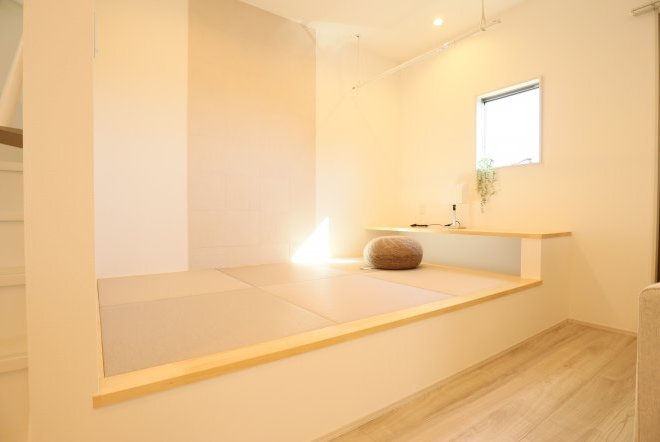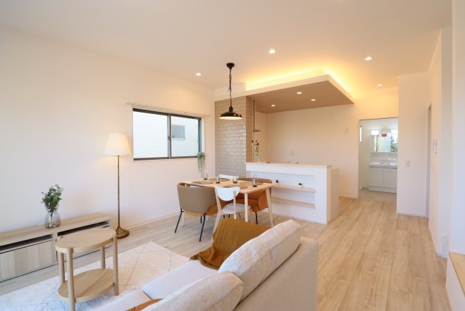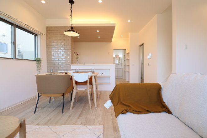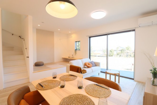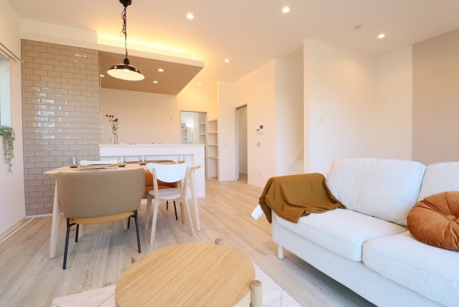 シンプルなカフェ風の内装で毎日の生活をおシャレに。集成材という人工の木材を使用しており、木材の形が変形しづらいため、隙間やひびが出にくいのが特徴です。和室スペース付きリビングでご家族団らんをお楽しみ下さい!