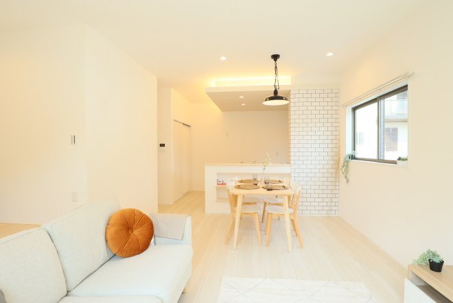 シンプルなカフェ風の内装で毎日の生活をおシャレに。集成材という人工の木材を使用しており、木材の形が変形しづらいため、隙間やひびが出にくいのが特徴です。和室スペース付きリビングでご家族団らんをお楽しみ下さい!