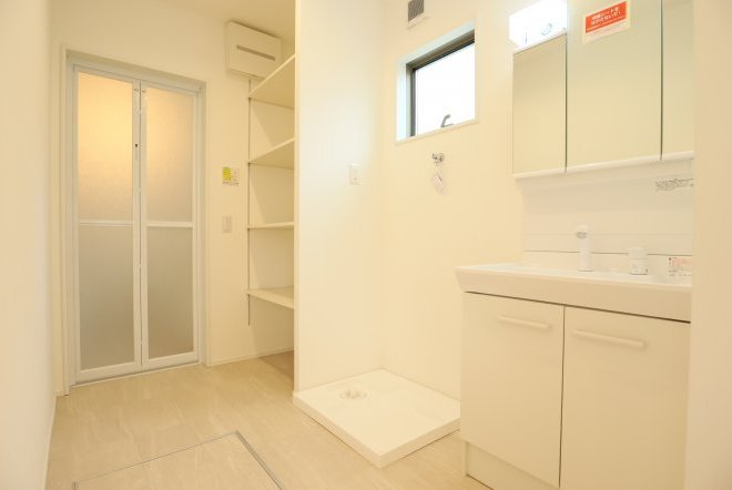 換気が可能な嬉しい小窓付き!ゆったり使える陶器製大型洗面器で水栓周りにやや傾斜があり水滴が溜まりにくい構造です!