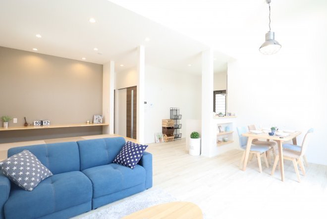 吹き抜けのある開放的な空間。壁付ウッドデッキの「アペル」はリビングが外まで広がっているような空間を創り出し、まさに太陽と風を感じれる家を演出。リビングには和室が用意されていて「ごろんっ♪」もできます。