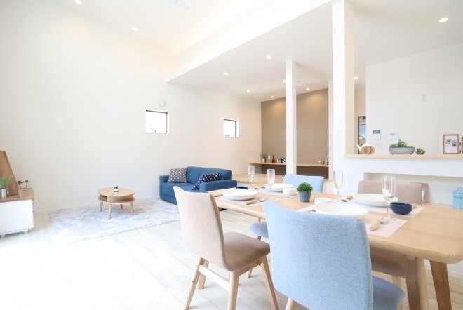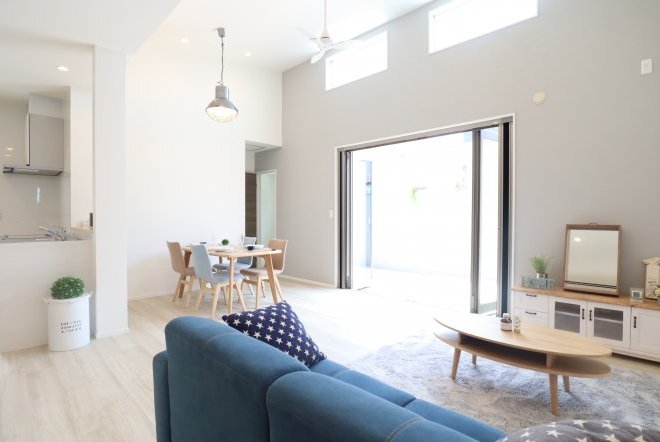 空間が広々と感じられる吹き抜け。フィックス窓から望む空の景色が毎日の生活に新鮮さや彩をプラスしてくれ、贅沢なリビングになります。