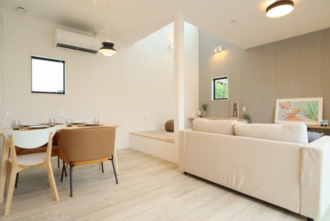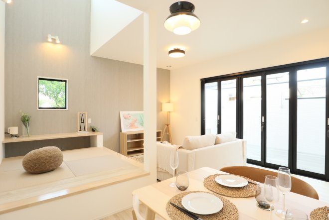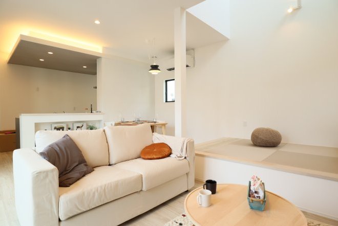 吹き抜けのある開放的な空間。壁付ウッドデッキの「アペル」はリビングが外まで広がっているような空間を創り出し、まさに太陽と風を感じれる家を演出。リビングには和室が用意されていて「ごろんっ♪」もできます。