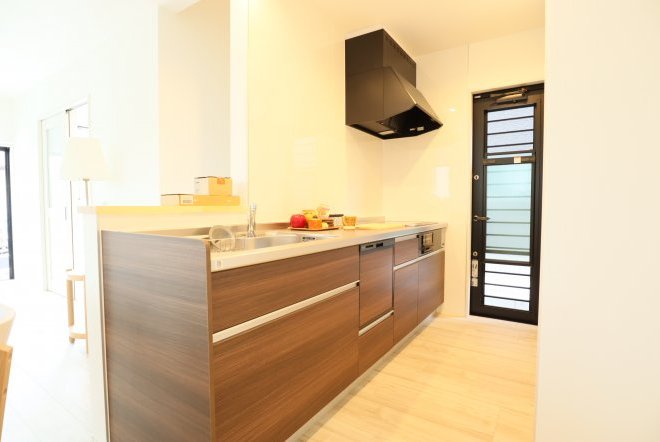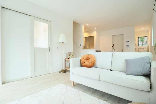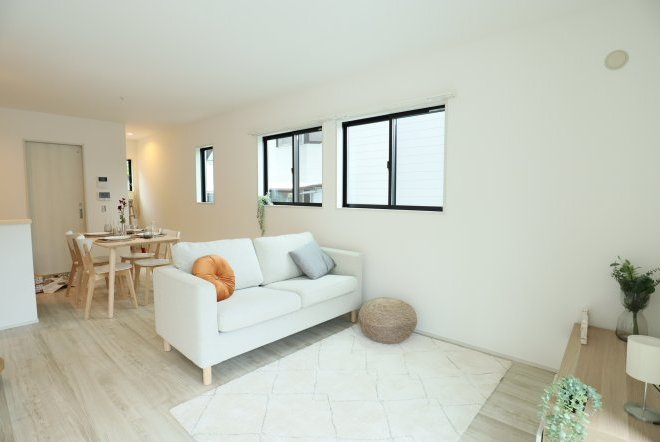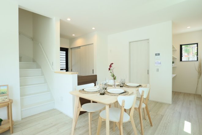 シンプルなカフェ風の内装で毎日の生活をおシャレに。集成材という人工の木材を使用しており、木材の形が変形しづらいため、隙間やひびが出にくいのが特徴です。和室スペース付きリビングでご家族団らんをお楽しみ下さい!