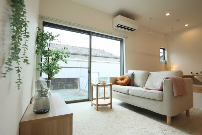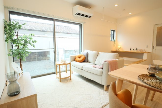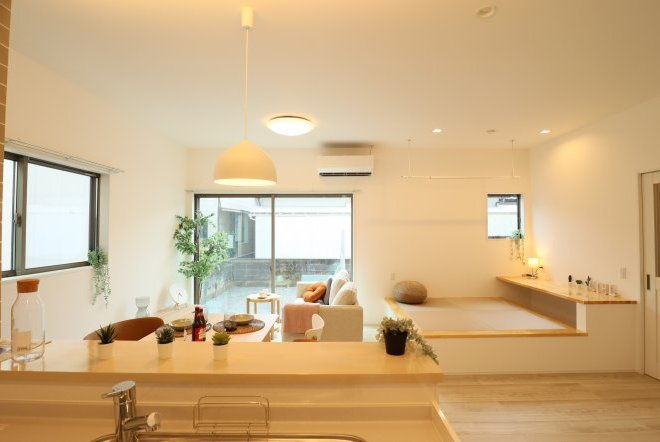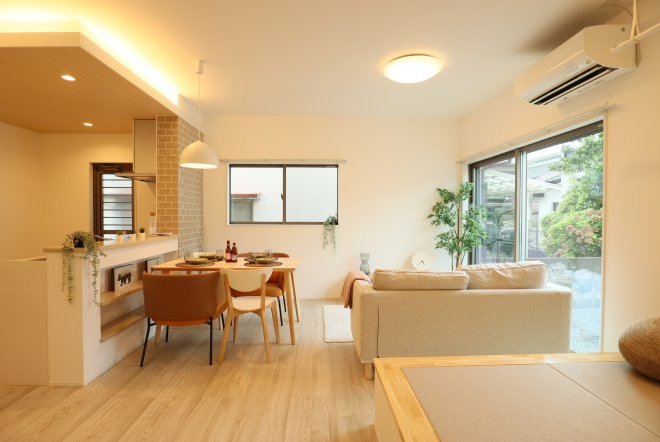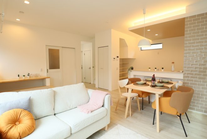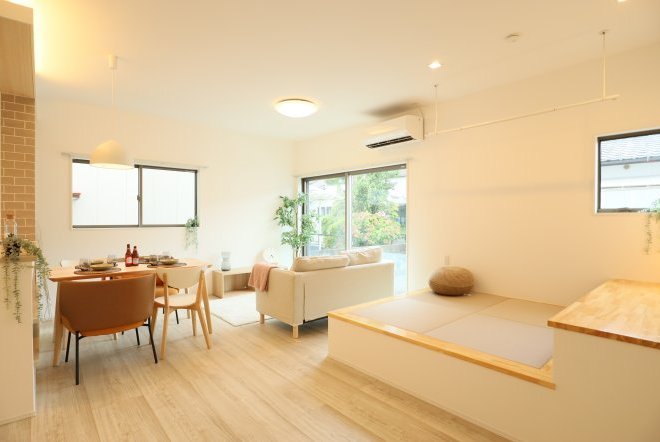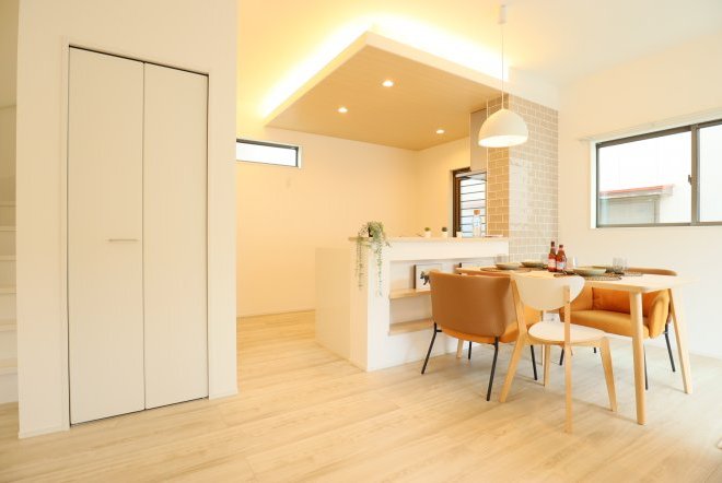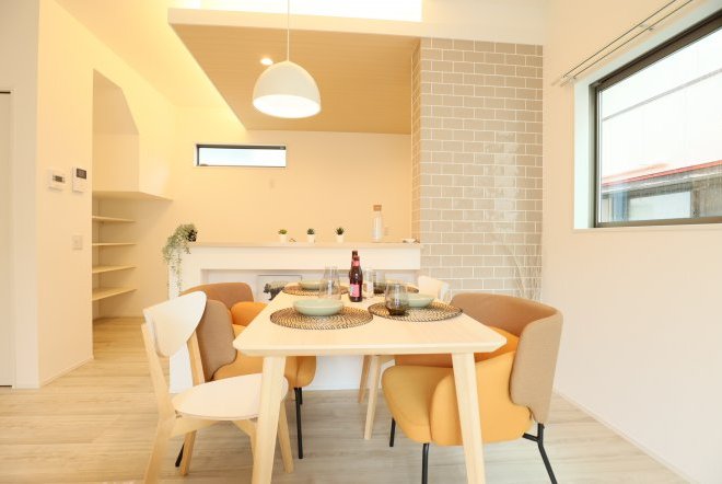 シンプルなカフェ風の内装で毎日の生活をおシャレに。集成材という人工の木材を使用しており、木材の形が変形しづらいため、隙間やひびが出にくいのが特徴です。和室スペース付きリビングでご家族団らんをお楽しみ下さい!