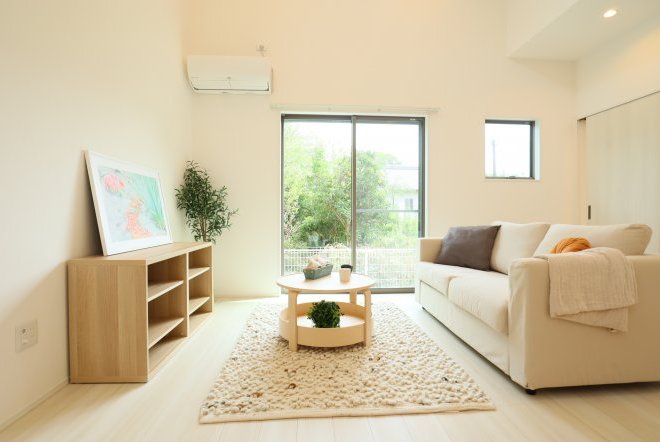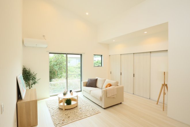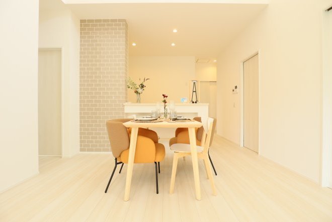 シンプルなカフェ風の内装で毎日の生活をおシャレに。集成材という人工の木材を使用しており、木材の形が変形しづらい為隙間やひびが出にくいのが特徴です。南向きリビングでご家族団欒の生活をお楽しみくださいませ。