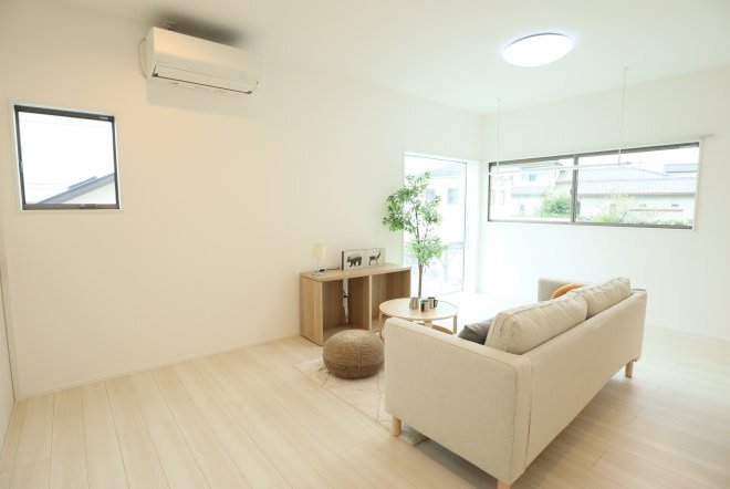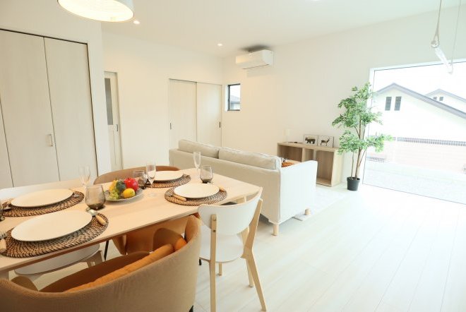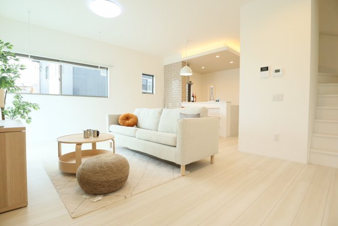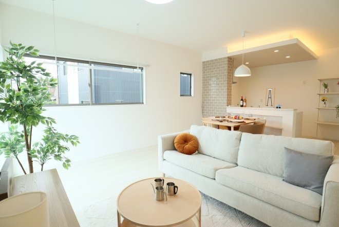 シンプルなカフェ風の内装で毎日の生活をおシャレに。集成材という人工の木材を使用しており、木材の形が変形しづらいため、隙間やひびが出にくいのが特徴です。和室スペース付きリビングでご家族団らんをお楽しみ下さい!