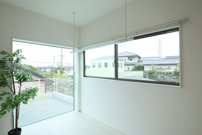 リクシル様の「LW」というサッシを特別に採用。通常のサッシは中桟と呼ばれる格子が入り視界のノイズになってしまいせっかくの眺望が半減してしまうのですが、この「LW」は中桟が無く、しかも障子が壁に引き込まれるのです。このことにより額縁で風景を切り取ったようになりとても良い絵になります。