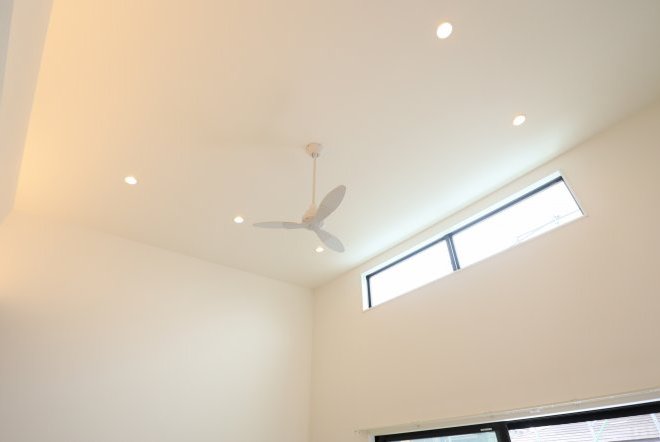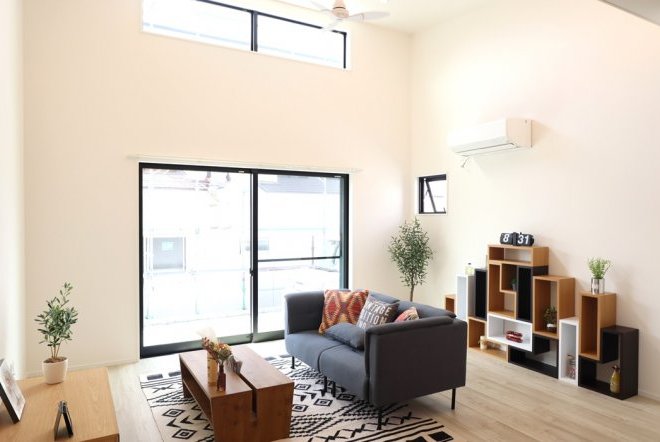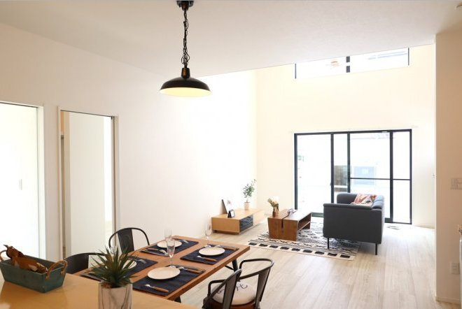 空間が広々と感じられる吹き抜け。フィックス窓から望む空の景色が毎日の生活に新鮮さや彩をプラスしてくれ、贅沢なリビングになります。