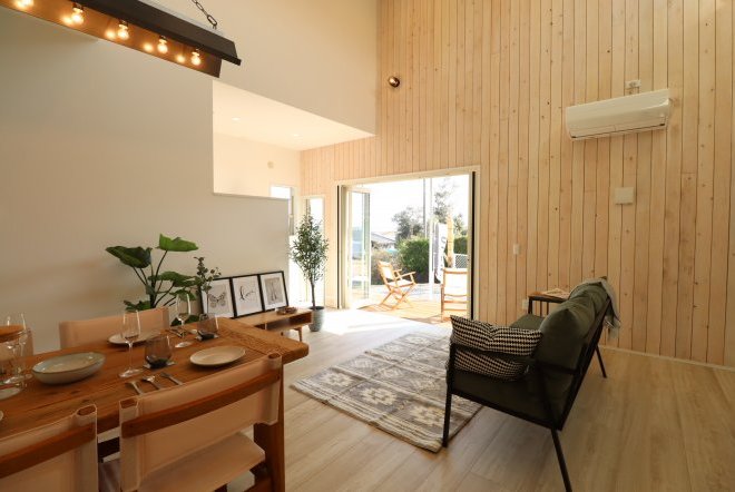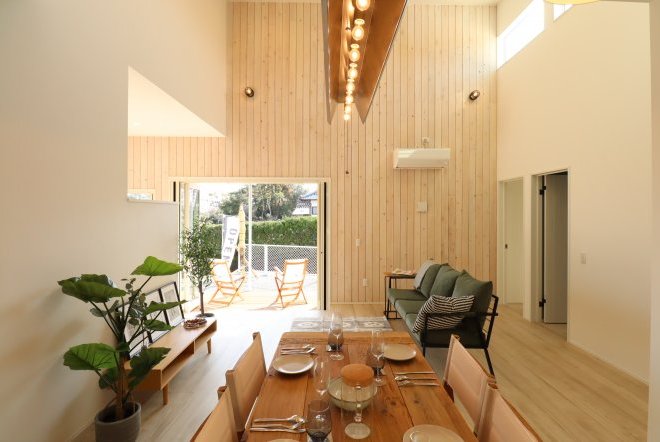自分らしく居心地いいサーフテイストの一軒家。カバードポーチ、開放感のある勾配天井に、板張りの壁。欲張りで画一的でない住宅、それがSURFER’S HOUSE。飾りすぎない贅沢な空間がここにあります。