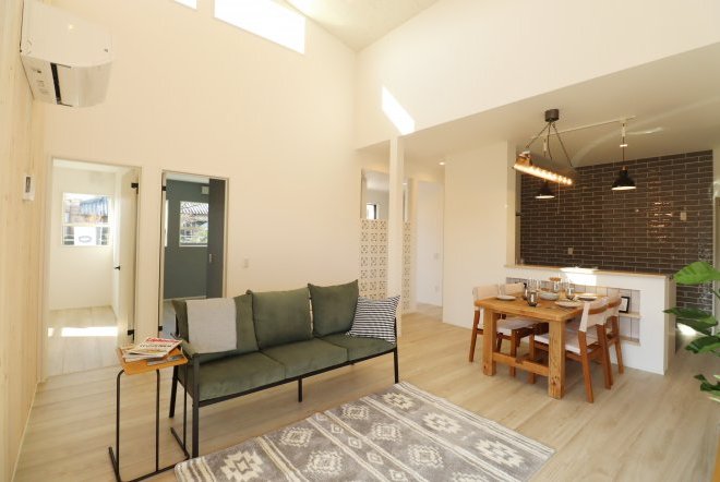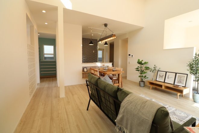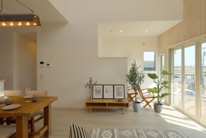空間が広々と感じられる吹き抜け。フィックス窓から望む空の景色が毎日の生活に新鮮さや彩をプラスしてくれ、贅沢なリビングになります。