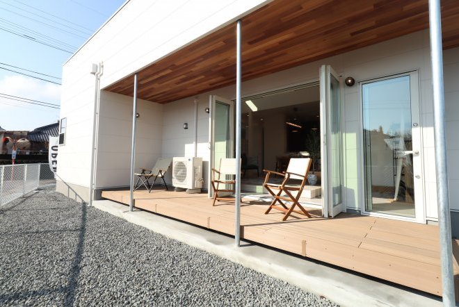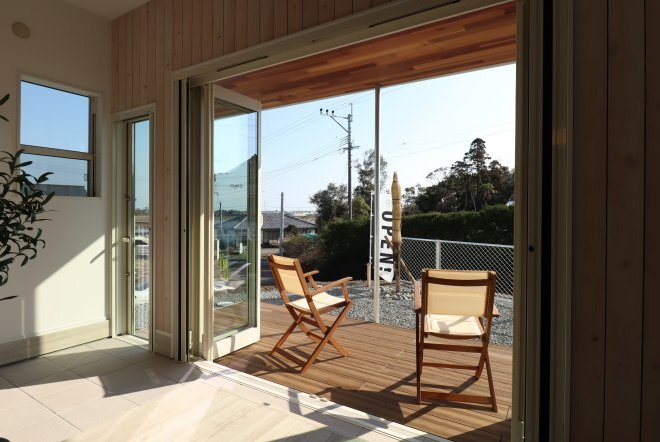 サーファーズハウスの大きな特徴の一つがこのカバードポーチ。カバードポーチでは友人を招いてバーベキューや家族団らんを楽しむことができます。リビングとカバードポーチの境目がフラットなので、リビングを広々と見せる効果もあります。
