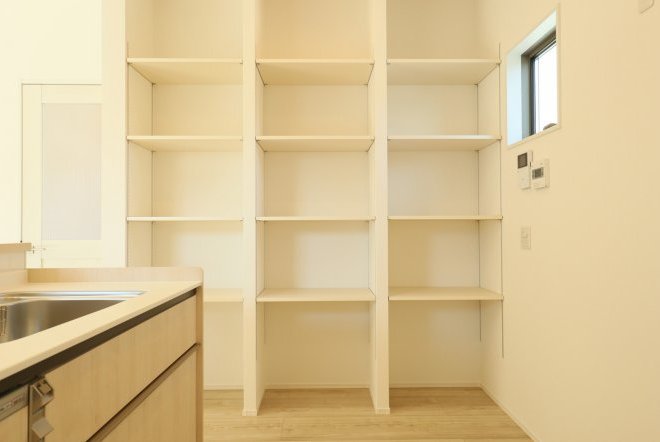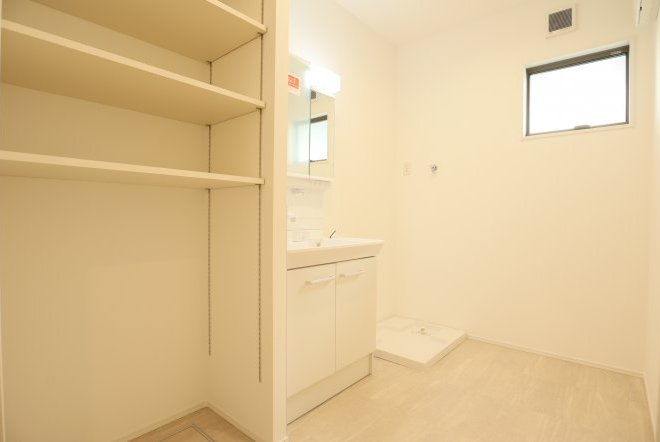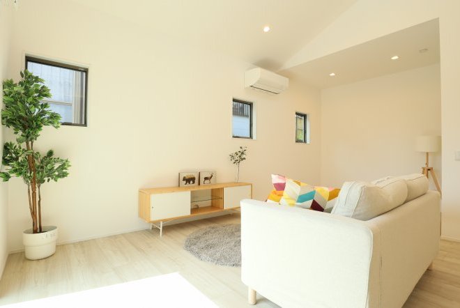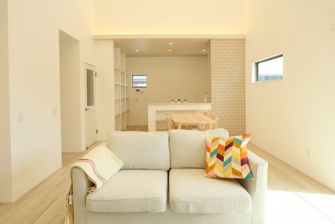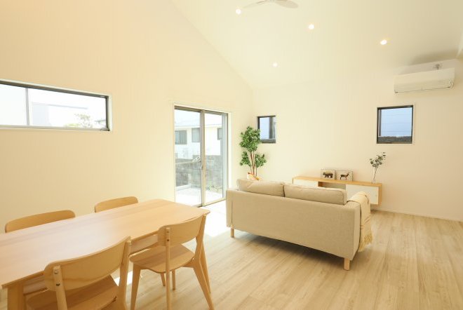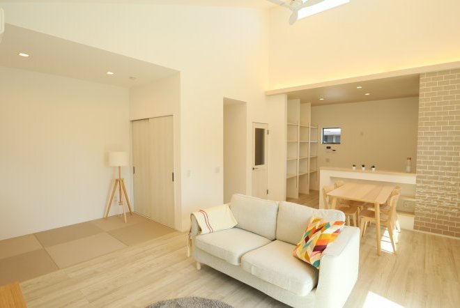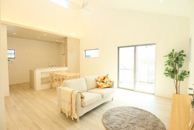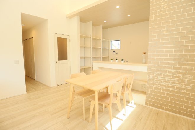 シンプルなカフェ風の内装で毎日の生活をおシャレに。集成材という人工の木材を使用しており、木材の形が変形しづらい為隙間やひびが出にくいのが特徴です。南向きリビングでご家族団欒の生活をお楽しみくださいませ。