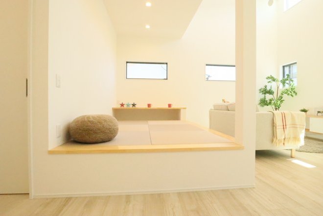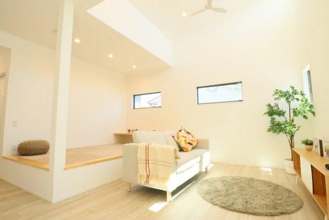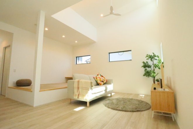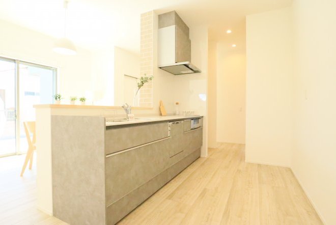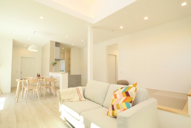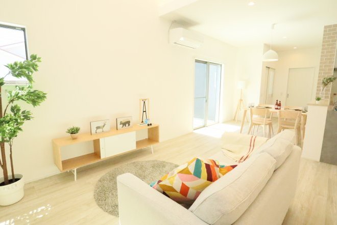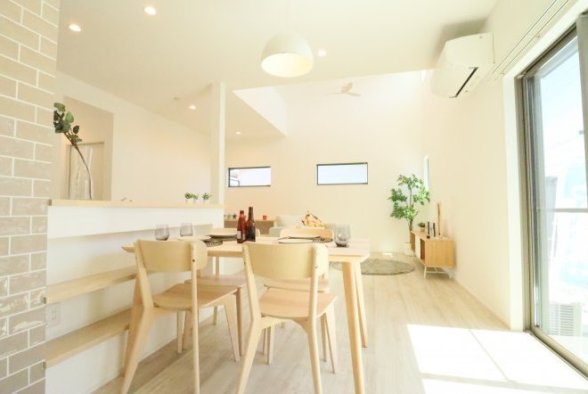 シンプルなカフェ風の内装で毎日の生活をおシャレに。集成材という人工の木材を使用しており、木材の形が変形しづらい為隙間やひびが出にくいのが特徴です。天井高があり、開放感のあるリビングでご家族団欒の生活をお楽しみくださいませ。