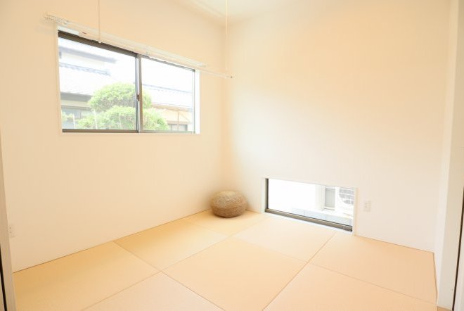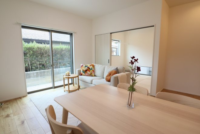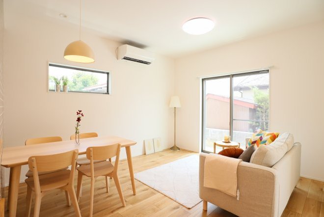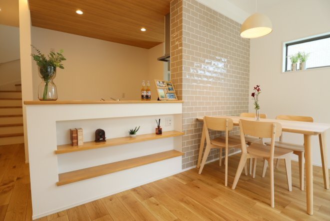 シンプルなカフェ風の内装で毎日の生活をおシャレに。集成材という人工の木材を使用しており、木材の形が変形しづらいため、隙間やひびが出にくいのが特徴です。和室スペース付きリビングでご家族団らんをお楽しみ下さい!