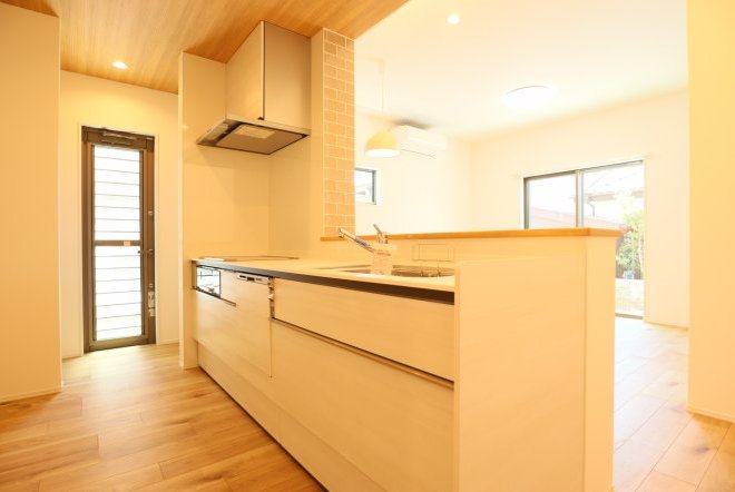 食洗機付き・IHコンロのシステムキッチンで毎日の家事やお手入れの負担が軽減されます。リビングでのご家族の様子を見ながら料理ができる人気の対面キッチン。
