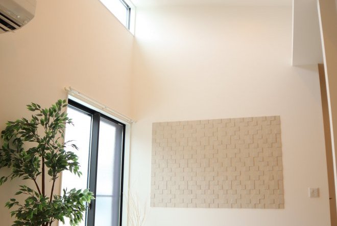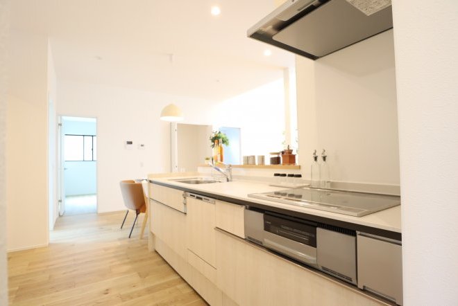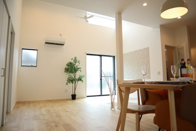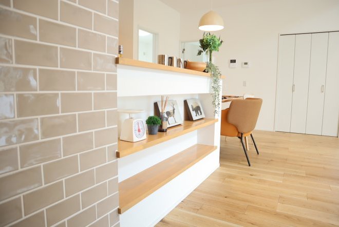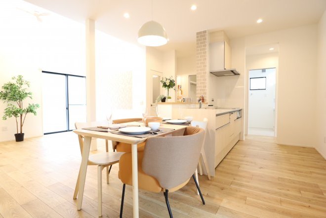 シンプルなカフェ風の内装で毎日の生活をおシャレに。集成材という人工の木材を使用しており、木材の形が変形しづらい為隙間やひびが出にくいのが特徴です。南向きリビングでご家族団欒の生活をお楽しみくださいませ。