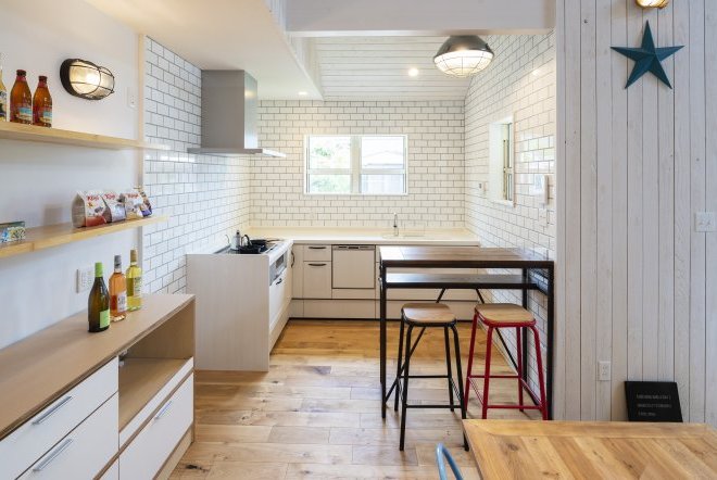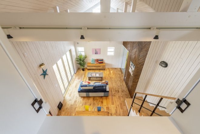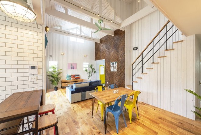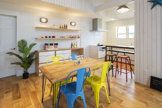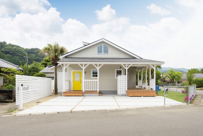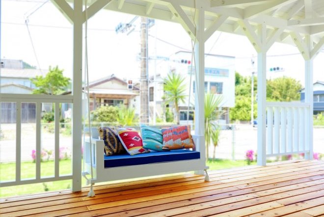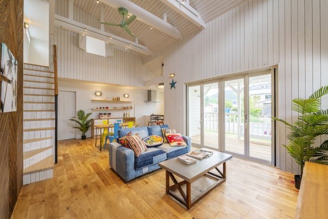 まるでカリフォルニアの住宅のようなカバードポーチ、開放感のある勾配天井に、古材の板張り。