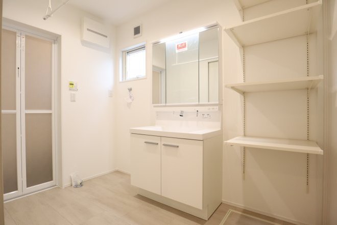 三面鏡の裏側は収納スペースとなっているため、洗面まわりの小物を収納するのにちょうど良く見た目もすっきりします。また、様々な角度からヘアスタイルの確認ができるのも三面鏡が付いている洗面化粧台のメリットです。