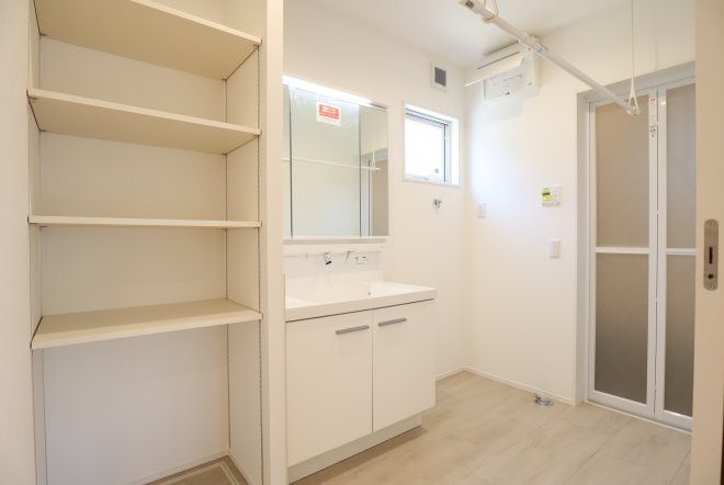 三面鏡の裏側は収納スペースとなっているため、洗面まわりの小物を収納するのにちょうど良く見た目もすっきりします。また、様々な角度からヘアスタイルの確認ができるのも三面鏡が付いている洗面化粧台のメリットです。