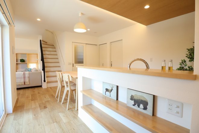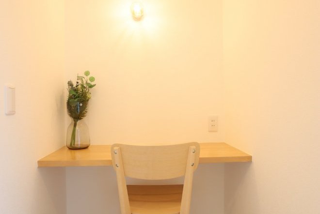 キッチンの向かいにはちょうど良いサイズのカウンターがあります。お子様の宿題やご夫婦のお仕事など家族を背面に感じながら行うことができます。