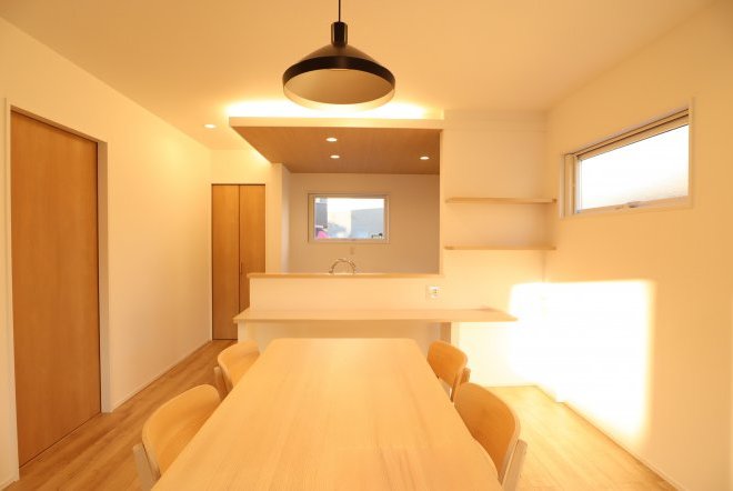 キッチン上の間接照明は、お子様の夜間寝かしつけ・就寝後、帰りが遅いご家族の為の常夜灯としても最適。デザイン性だけでなく機能性も兼ね備えています。