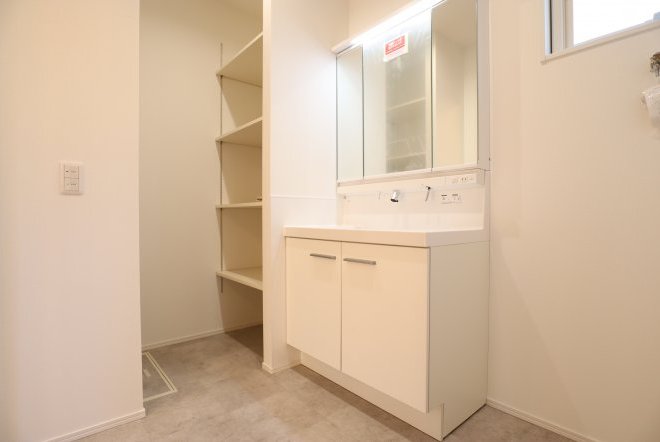 三面鏡の裏側は収納スペースとなっているため、洗面まわりの小物を収納するのにちょうど良く見た目もすっきりします。また、様々な角度からヘアスタイルの確認ができるのも三面鏡が付いている洗面化粧台のメリットです。