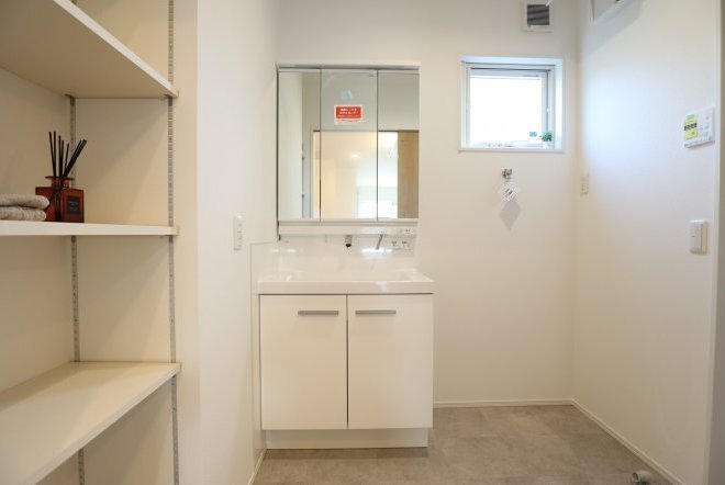 三面鏡の裏側は収納スペースとなっているため、洗面まわりの小物を収納するのにちょうど良く見た目もすっきりします。また、様々な角度からヘアスタイルの確認ができるのも三面鏡が付いている洗面化粧台のメリットです。