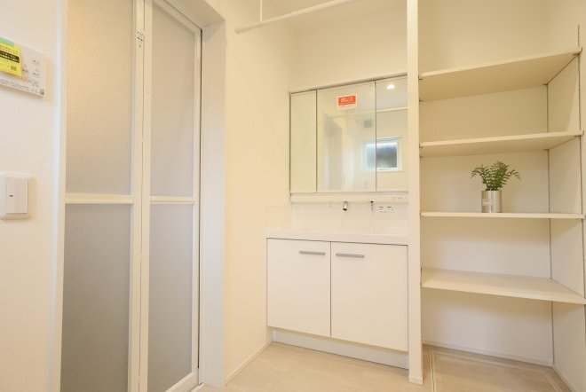 三面鏡の裏側は収納スペースとなっているため、洗面まわりの小物を収納するのにちょうど良く見た目もすっきりします。また、様々な角度からヘアスタイルの確認ができるのも三面鏡が付いている洗面化粧台のメリットです。
