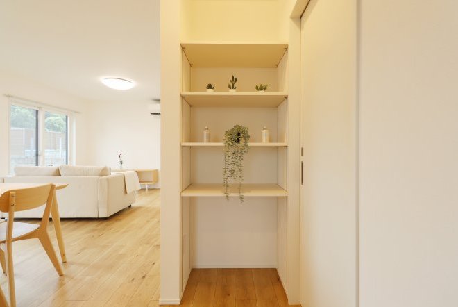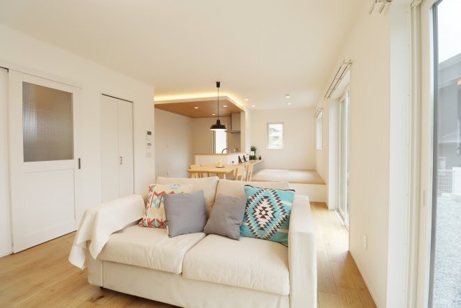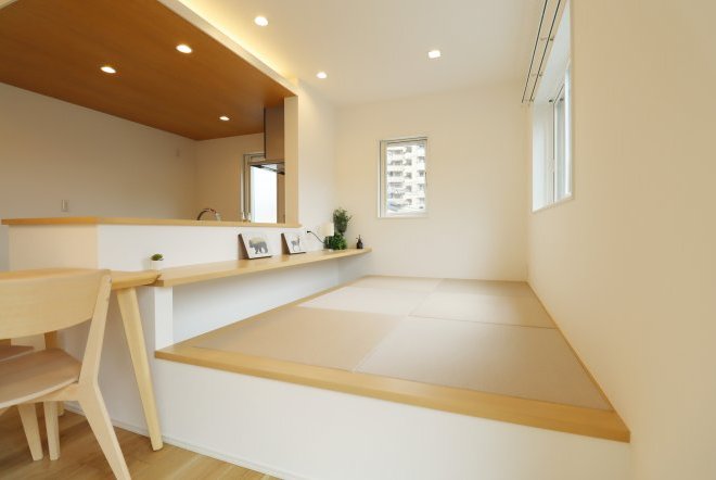 お子様からお年寄りまで様々なシーンに合わせて多機能に利用できるスペースです。フローリングから段差を設けていますので、ベンチとしての活用もでき、リビングでの過ごし方に動きを演出してくれます。